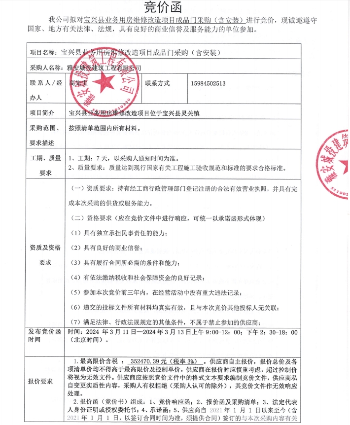 寶興縣業(yè)務(wù)用房維修改造項(xiàng)目成品門采購(含安裝)競(jìng)價(jià)公告