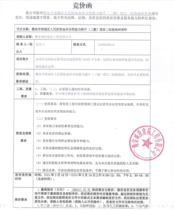 雅安市雨城區(qū)人民醫(yī)院金沙分院能力提升(二期)項(xiàng)目二標(biāo)段地磚采購競(jìng)價(jià)公告