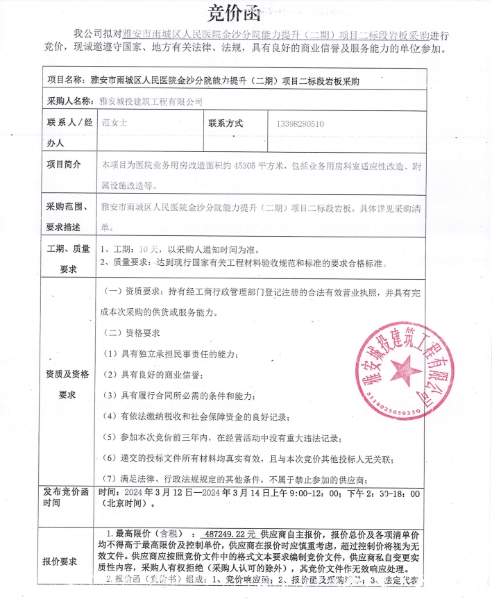 雅安市雨城區(qū)人民醫(yī)院金沙分院能力提升(二期)項目二標段巖板采購競價公告