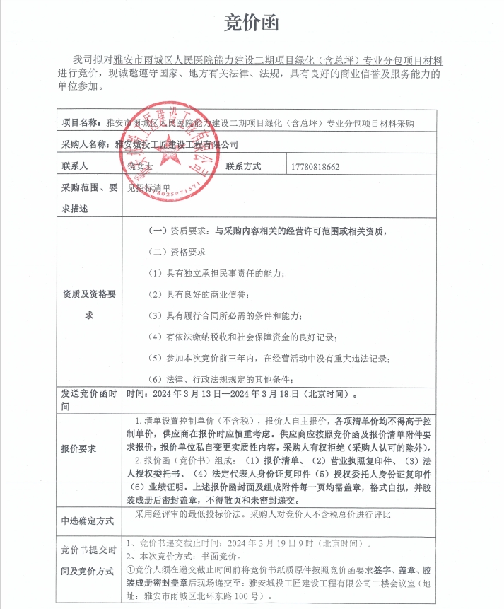 雅安市雨城區(qū)人民醫(yī)院能力建設(shè)二期項(xiàng)目綠化(含總坪)專業(yè)分包項(xiàng)目材料采購(gòu)競(jìng)價(jià)公告