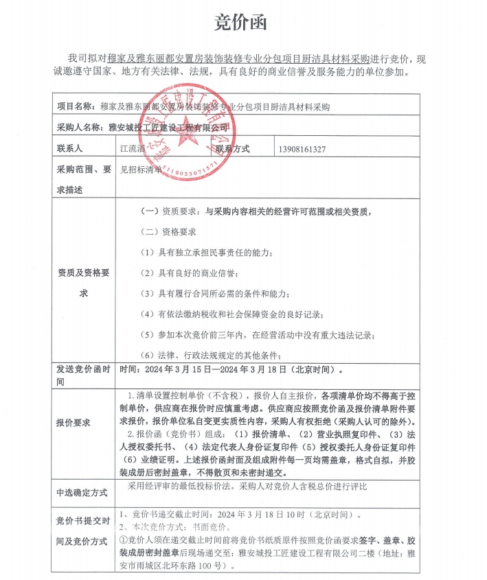 穆家及雅東麗都安置房裝飾裝修專(zhuān)業(yè)分包項(xiàng)目廚潔具材料采購(gòu)競(jìng)價(jià)公告