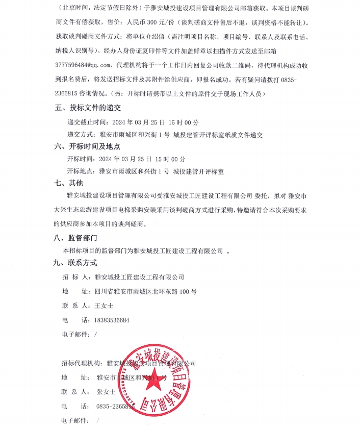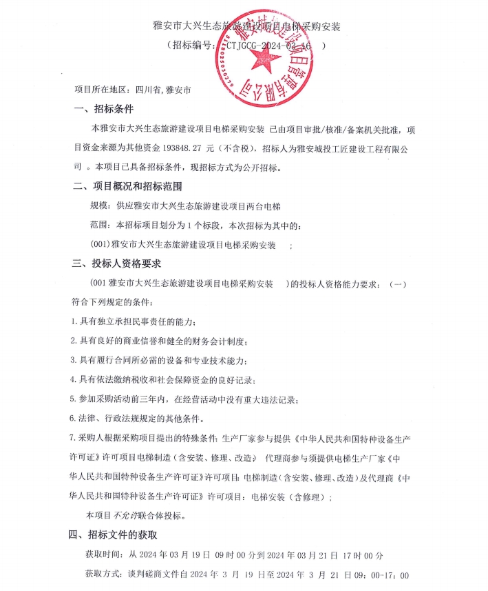 雅安市大興生態(tài)旅游建設(shè)項目電梯采購安裝公告