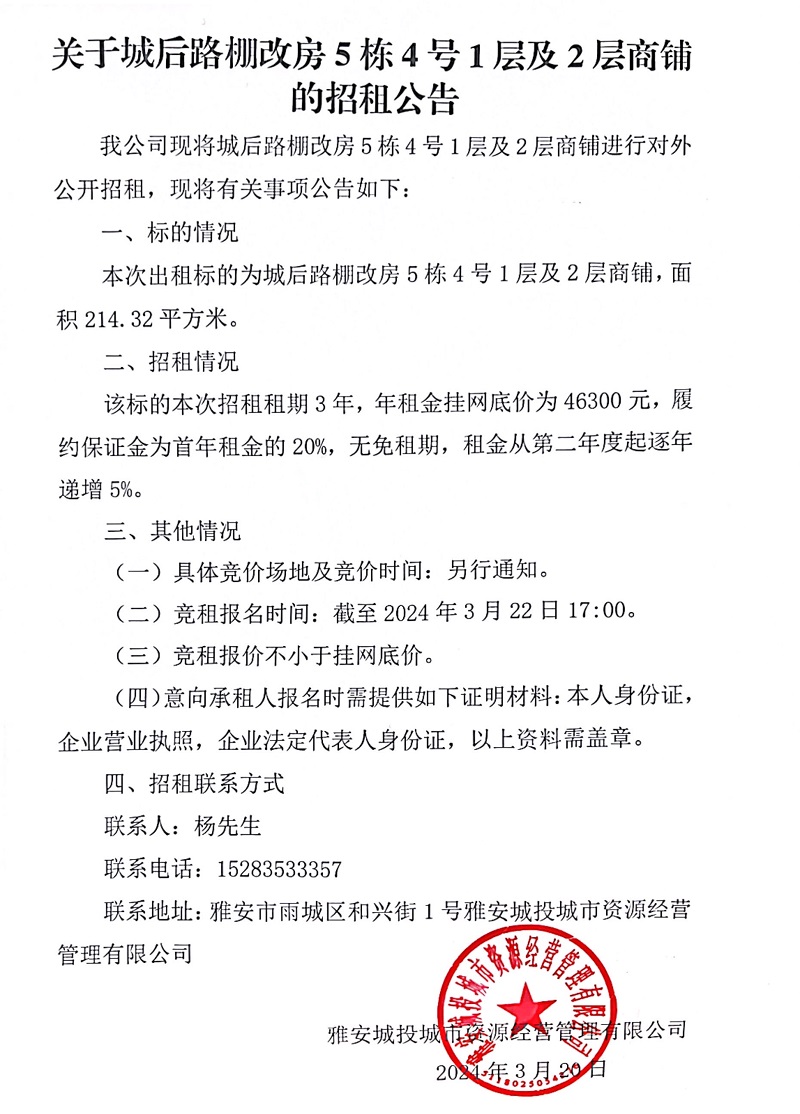關(guān)于城后路棚改房5棟4號(hào)1層及2層商鋪的招租公告