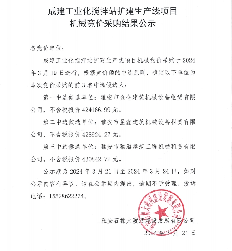 成建工業(yè)化攪拌站擴(kuò)建生產(chǎn)線項(xiàng)目機(jī)械競(jìng)價(jià)采購(gòu)結(jié)果公示