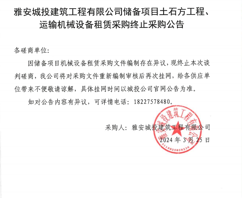 雅安城投建筑工程有限公司儲(chǔ)備項(xiàng)目土石工程、運(yùn)輸機(jī)械設(shè)備租賃采購(gòu)終止采購(gòu)公告