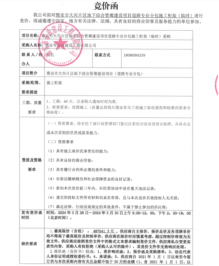 雅安市大興片區(qū)地下綜合管廊建設(shè)項(xiàng)目道路專業(yè)分包施工桁架(臨時(shí))采購競(jìng)價(jià)公告