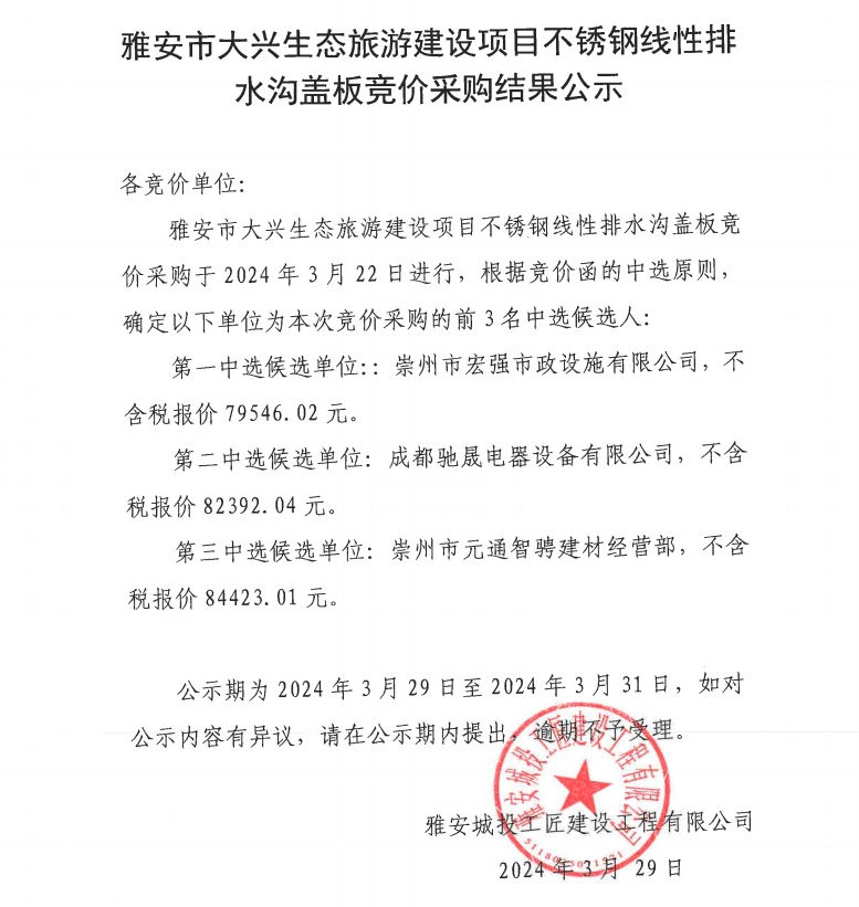 雅安市大興生態(tài)旅游建設(shè)項(xiàng)目不銹鋼線性排水溝蓋板競(jìng)價(jià)采購(gòu)結(jié)果公示