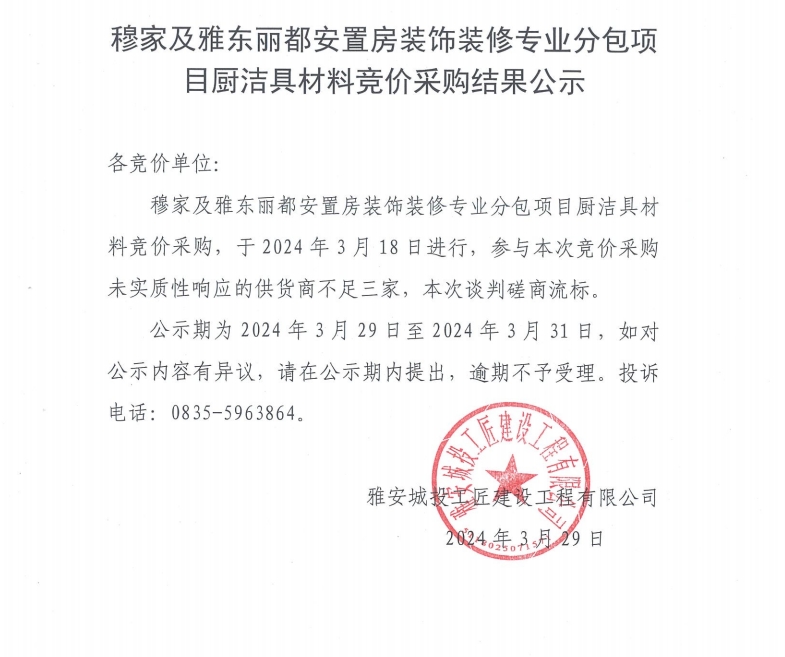 穆家及雅東麗都安置房裝飾裝修專業(yè)分包項(xiàng)目廚潔具材料競價采購結(jié)果公示
