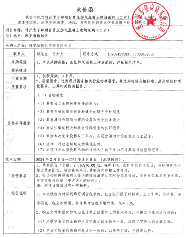 雅州壹號(hào)院項(xiàng)目蒸壓加氣混凝土砌塊采購(第二次)競價(jià)公告