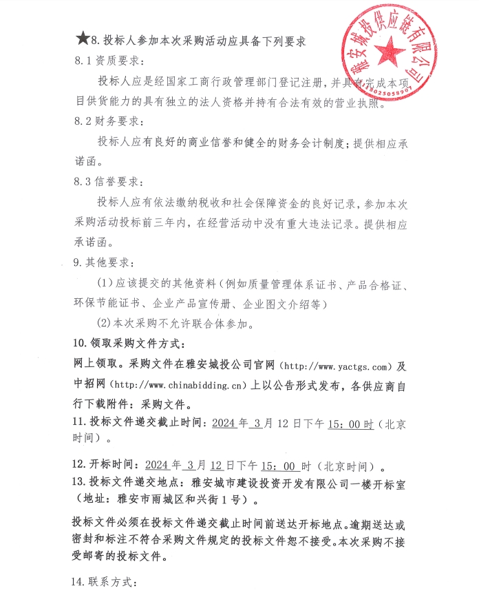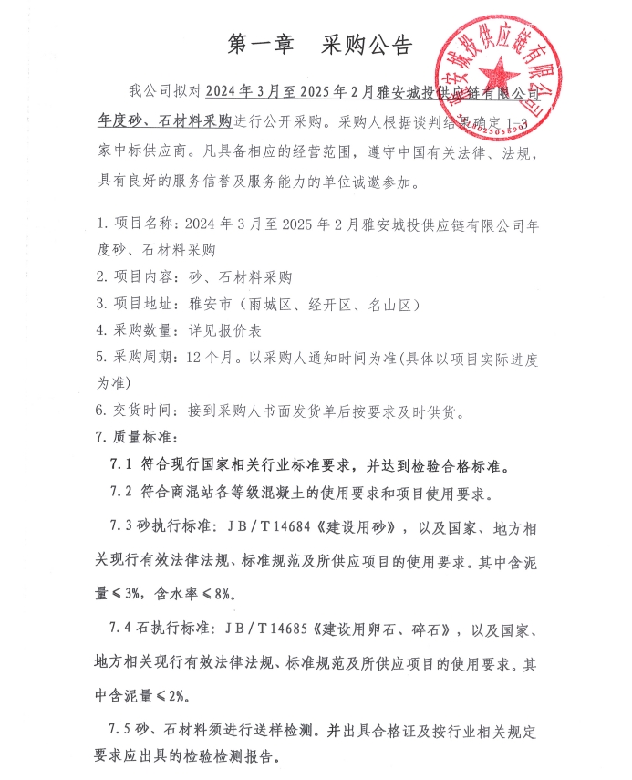 2024年3月至2025年2月雅安城投供應鏈有限公司年度砂、石材料采購公告