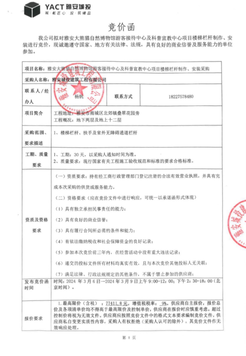 雅安大熊貓自然博物館游客接待中心及科普宣教中心項(xiàng)目樓梯欄桿制作、安裝采購競價公告