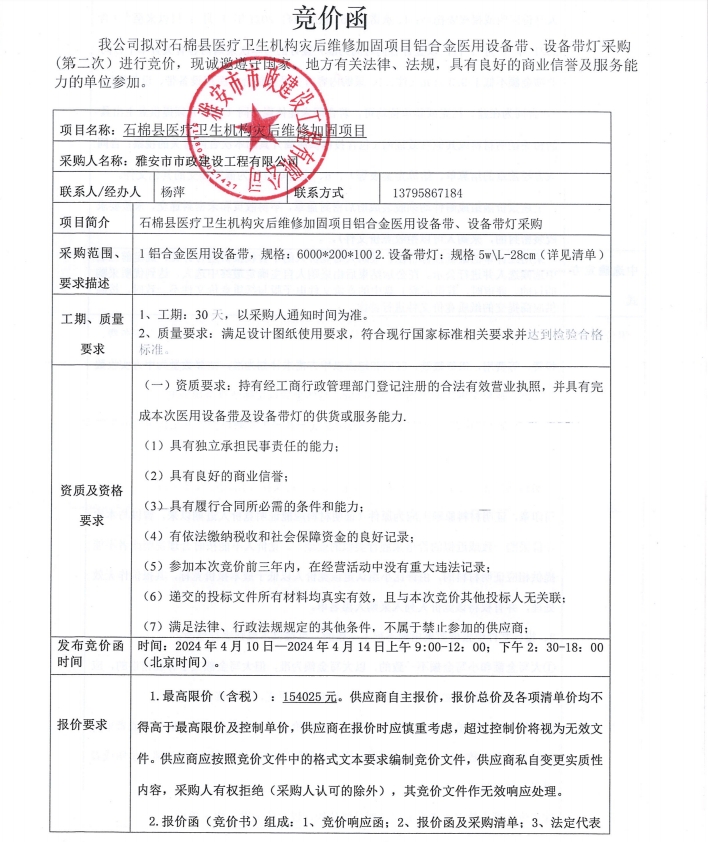 石棉縣醫(yī)療機構(gòu)災后維修加固項目鋁合金醫(yī)用設(shè)備帶、設(shè)備帶燈采購(第二次)競價公告