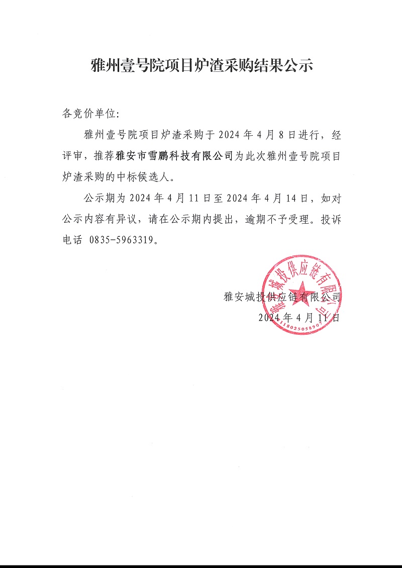 雅州壹號(hào)院項(xiàng)目爐渣采購(gòu)結(jié)果公示