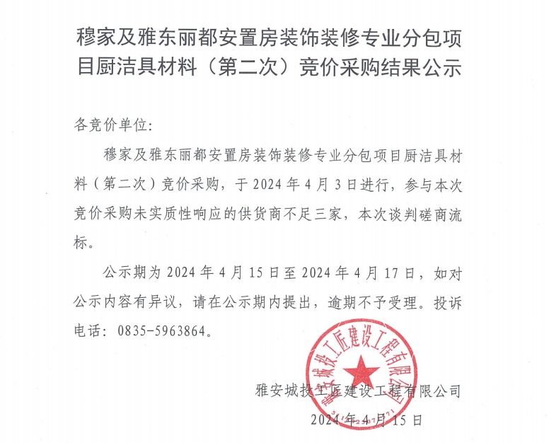 穆家及雅東麗都安置房裝飾裝修專業(yè)分包項(xiàng)目廚具材料(第二次)競(jìng)價(jià)采購結(jié)果公示