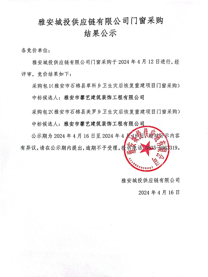 雅安城投供應鏈有限公司門窗采購結(jié)果公示
