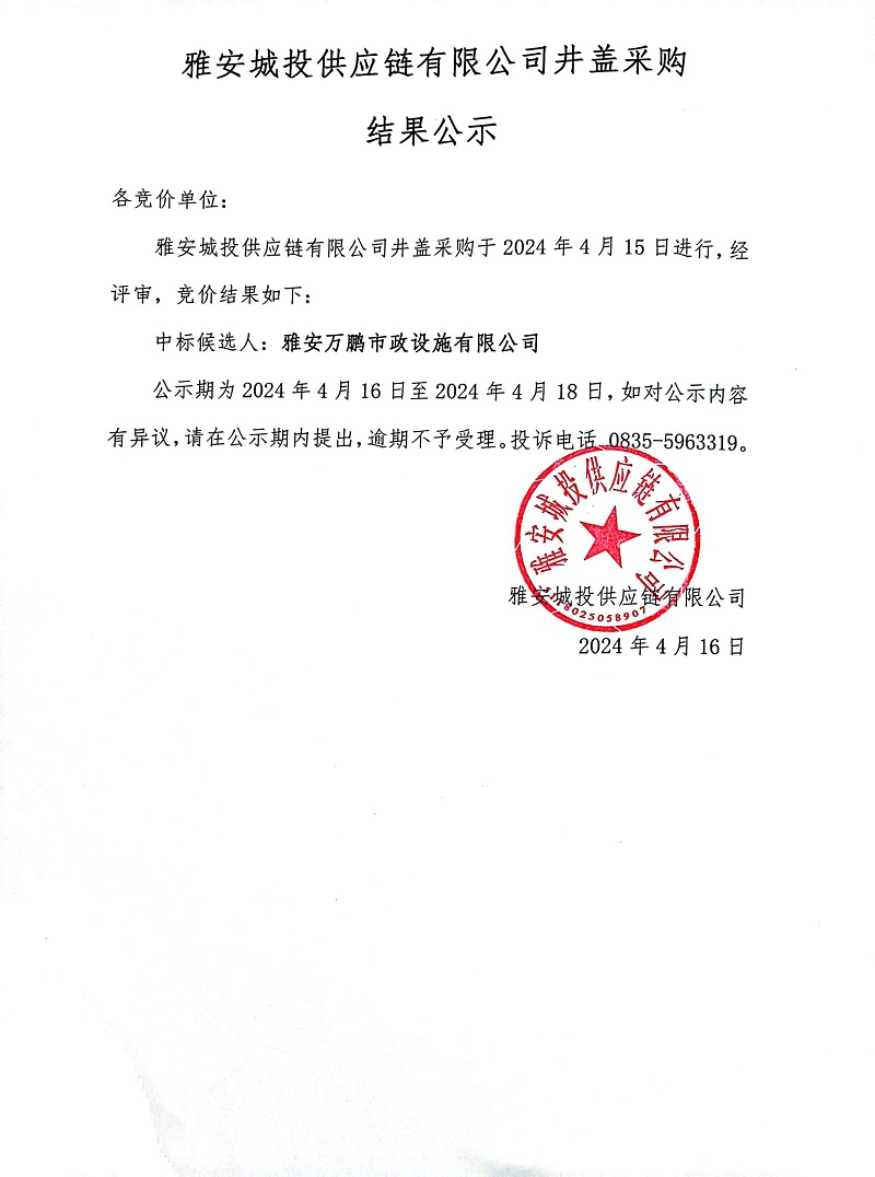 雅安城投供應(yīng)鏈有限公司井蓋采購(gòu)結(jié)果公示