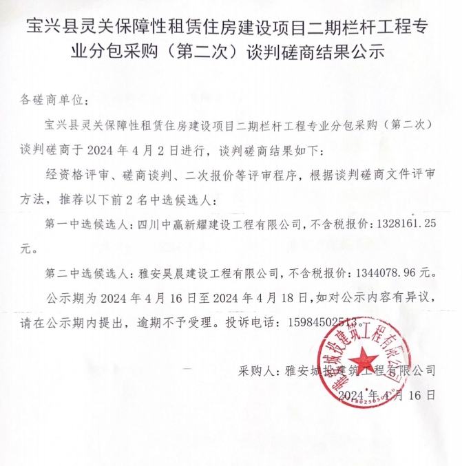 寶興縣靈關(guān)保障性租賃住房建設(shè)項(xiàng)目二期欄桿工程專(zhuān)業(yè)分包采購(gòu)(第二次)談判磋商結(jié)果公示