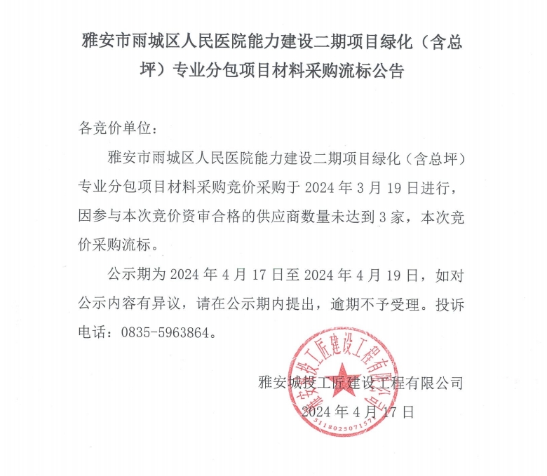 雅安市雨城區(qū)人民醫(yī)院能力建設二期項目綠化(含總坪)專業(yè)分包項目材料采購流標公告