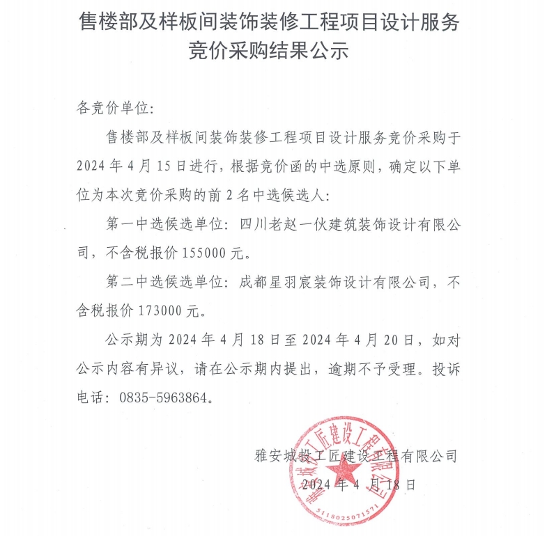售樓部及樣板間裝飾裝修工程項目設計服務競價采購結果公示