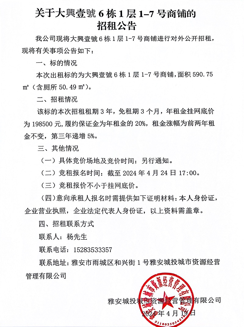 關(guān)于大興壹號6棟1層1-7號商鋪的招租公告