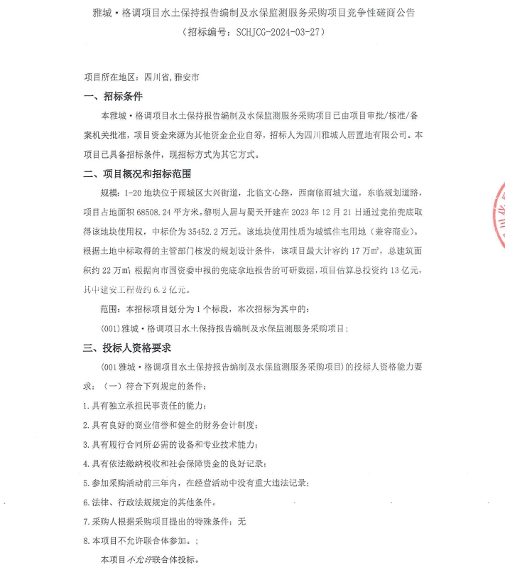 雅城·格調(diào)項目水土保持報告編制及水保監(jiān)測服務采購項目競爭性磋商公告