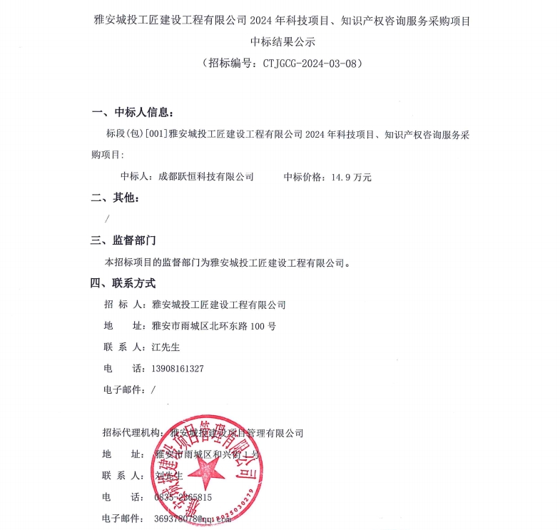 雅安城投工匠建設工程有限公司2024年科技項目、知識產(chǎn)權咨詢服務采購項目中標結果公示