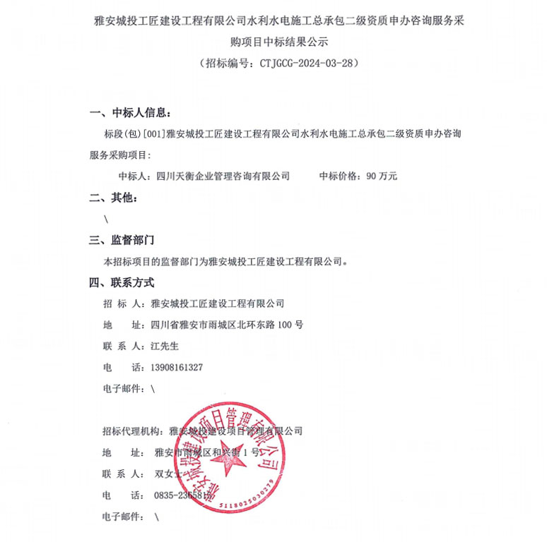 雅安城投工匠建設(shè)工程有限公司水利水電施工總承包二級(jí)資質(zhì)申辦咨詢服務(wù)采購(gòu)項(xiàng)目中標(biāo)結(jié)果公示