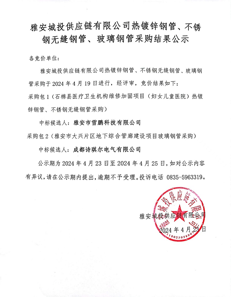 雅安城投供應(yīng)鏈有限公司熱鍍鋅鋼管、不銹鋼無(wú)縫鋼管、玻璃鋼管采購(gòu)結(jié)果公示
