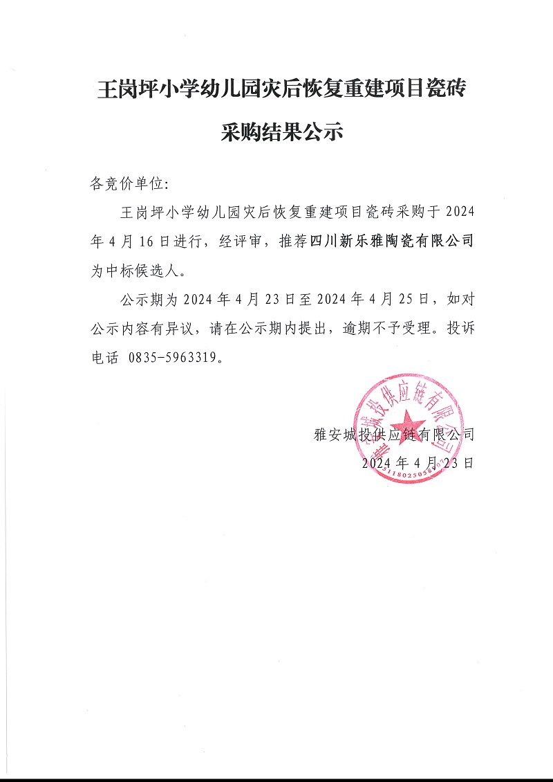 王崗坪小學幼兒園災后恢復重建項目瓷磚采購結(jié)果公示