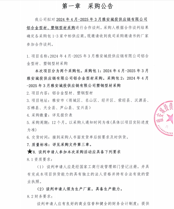 2024年4月-2025年3月雅安城投供應(yīng)鏈有限公司鋁合金型材、塑鋼型材采購(gòu)公告