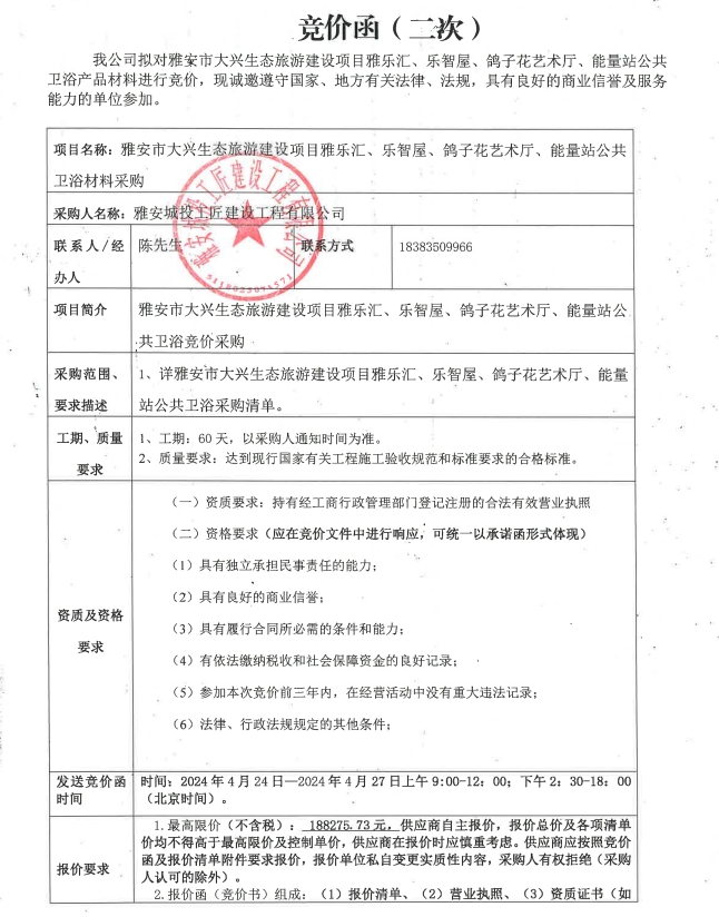 雅安市大興生態(tài)旅游建設(shè)項(xiàng)目雅樂匯、樂智屋、鴿子花藝術(shù)廳、能量站公共衛(wèi)浴材料采購(gòu)(第二次)競(jìng)價(jià)公告