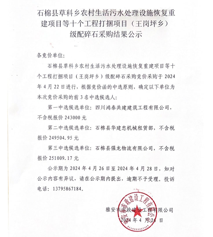 石棉縣草科鄉(xiāng)農(nóng)村生活污水處理設(shè)施恢復(fù)重建項(xiàng)目等十個(gè)工程打捆項(xiàng)目(王崗坪鄉(xiāng))級(jí)配碎石采購(gòu)結(jié)果公示