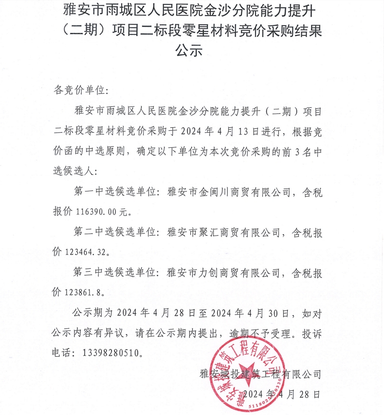 雅安市雨城區(qū)人民醫(yī)院金沙分院能力提升(二期)項(xiàng)目二標(biāo)段零星材料競價采購結(jié)果公示