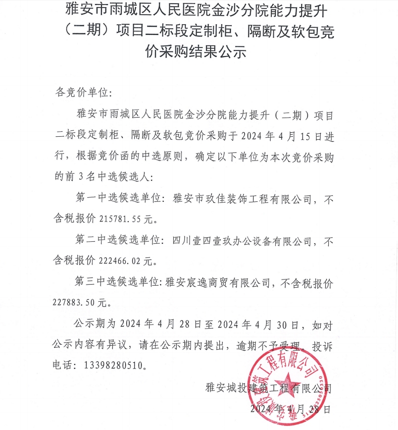 雅安市雨城區(qū)人民醫(yī)院金沙分院能力提升(二期)項(xiàng)目二標(biāo)段定制柜、隔斷及軟包競(jìng)價(jià)采購(gòu)結(jié)果公示