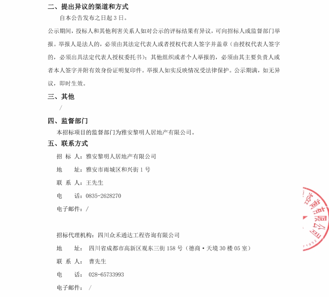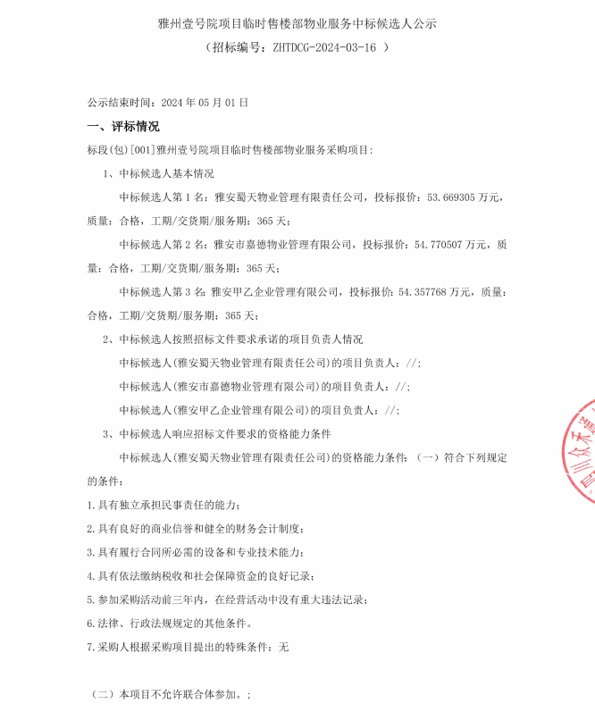 雅州壹號院臨時售樓部物業(yè)服務(wù)中標(biāo)候選人公示