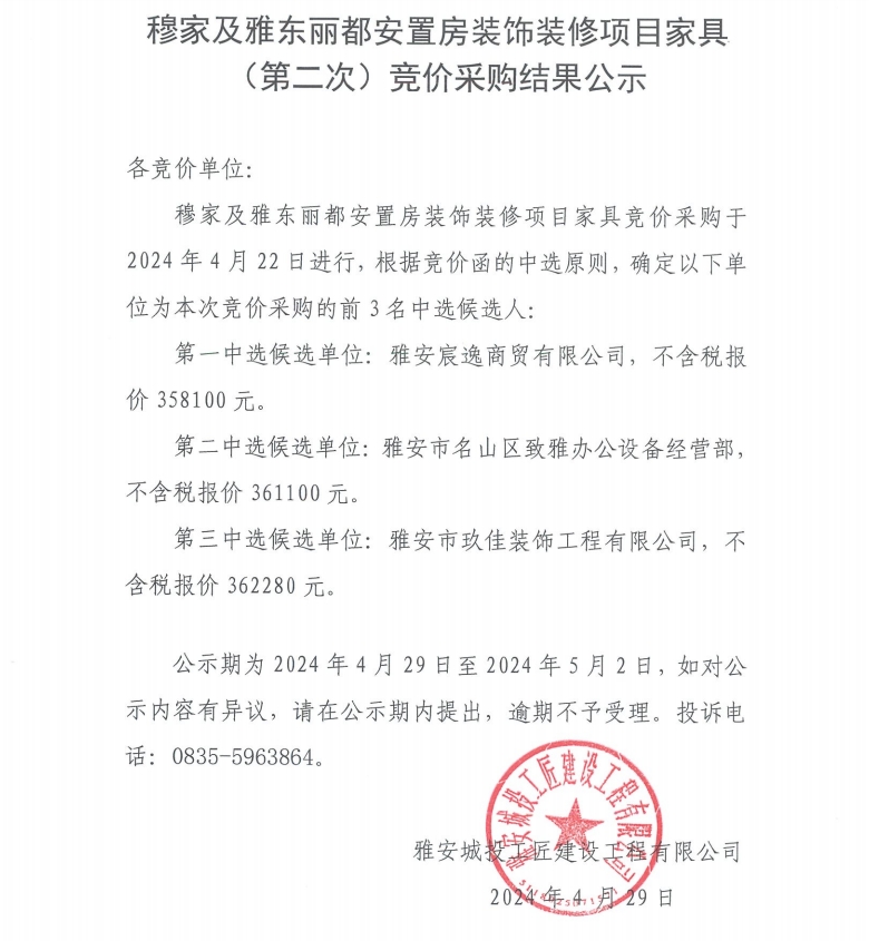 穆家及雅東麗都安置房裝飾裝修項目家具(第二次)競價采購結果公示