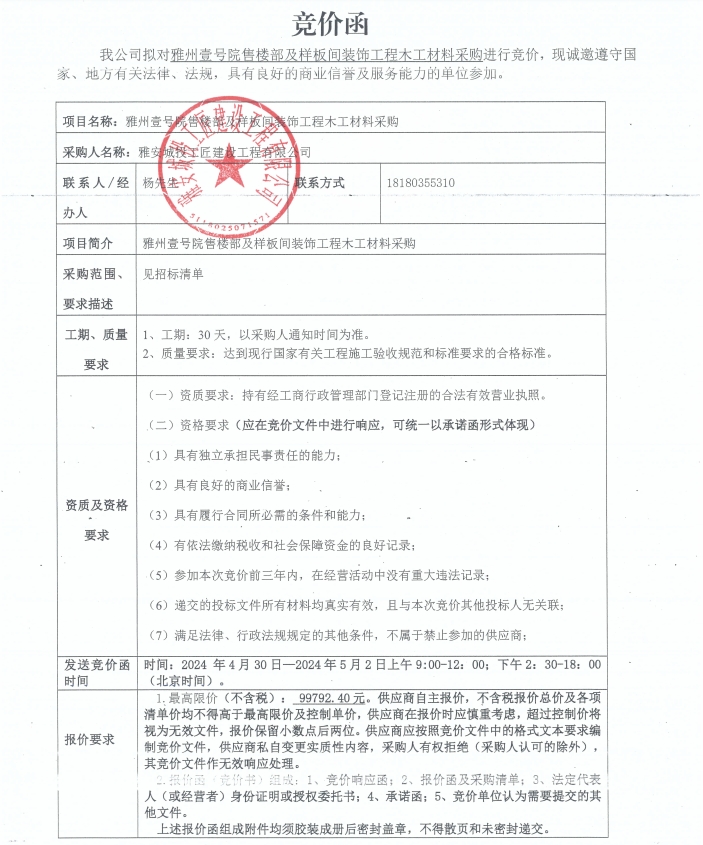 競(jìng)價(jià)函-木工材料采購-雅州壹號(hào)院售樓部及樣板間