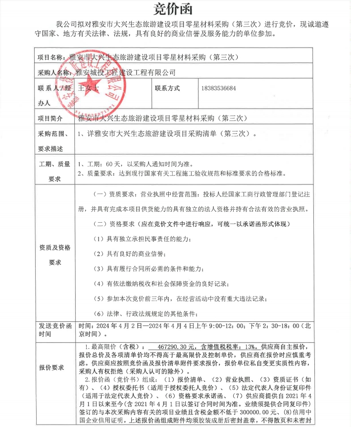 雅安市大興生態(tài)旅游建設(shè)項(xiàng)目零星材料采購(gòu)(第三次)競(jìng)價(jià)公告