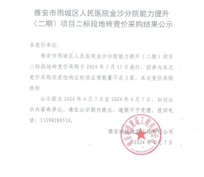 雅安市雨城區(qū)人民醫(yī)院金沙分院能力提升(二期)項(xiàng)目二標(biāo)段地磚競價采購結(jié)果公示