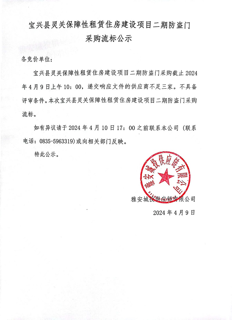寶興縣靈關(guān)保障性租賃住房建設(shè)項目二期防盜門采購流標(biāo)公示