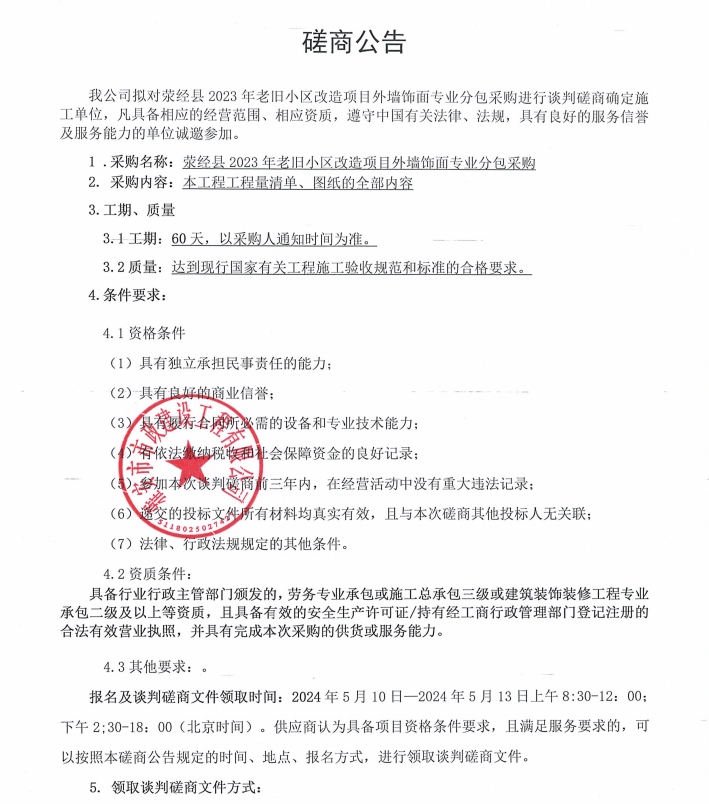 滎經(jīng)縣2023年老舊小區(qū)改造項(xiàng)目外墻飾面專業(yè)分包采購磋商公告