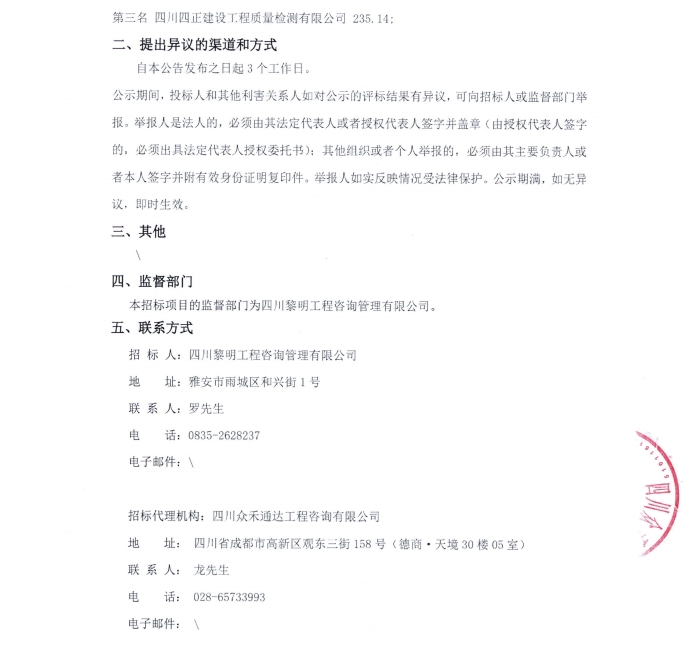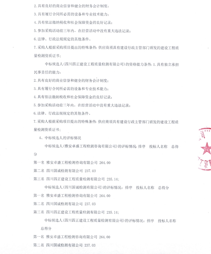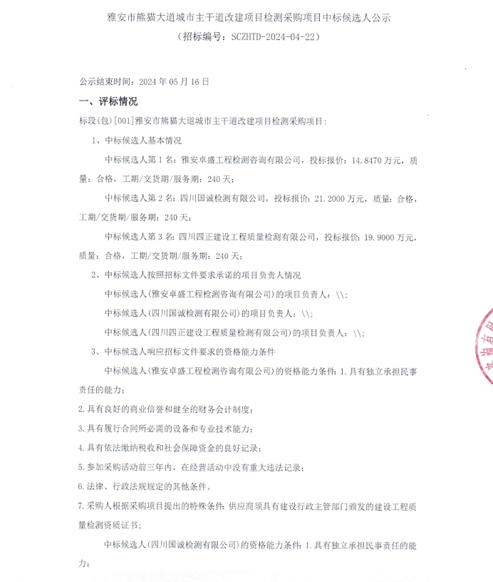 雅安市熊貓大道城市主干道改建項(xiàng)目檢測(cè)采購(gòu)項(xiàng)目中標(biāo)候選人公示