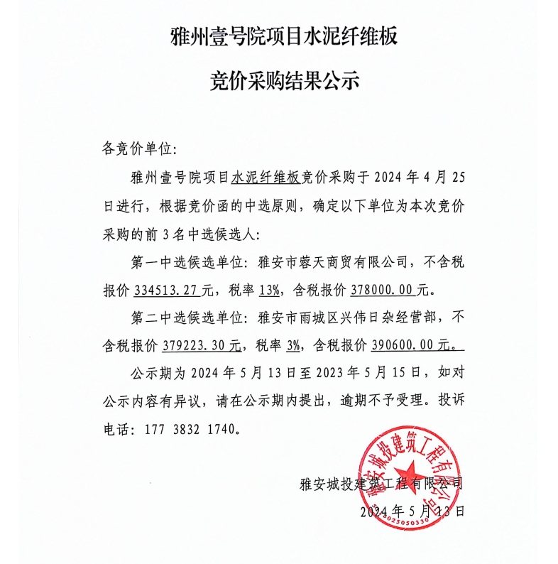 雅州壹號院項目水泥纖維板競價采購結(jié)果公示