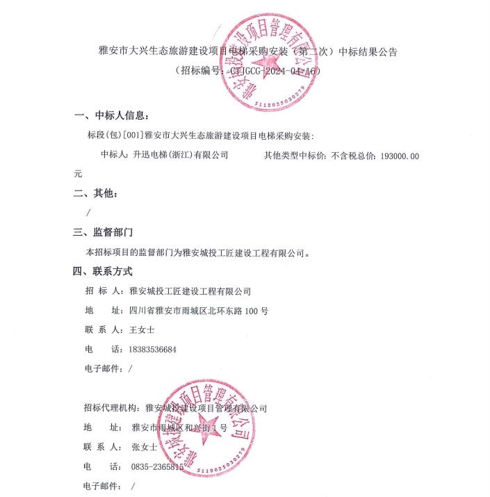 雅安市大興生態(tài)旅游建設(shè)項目電梯采購安裝(第二次)中標(biāo)結(jié)果公告