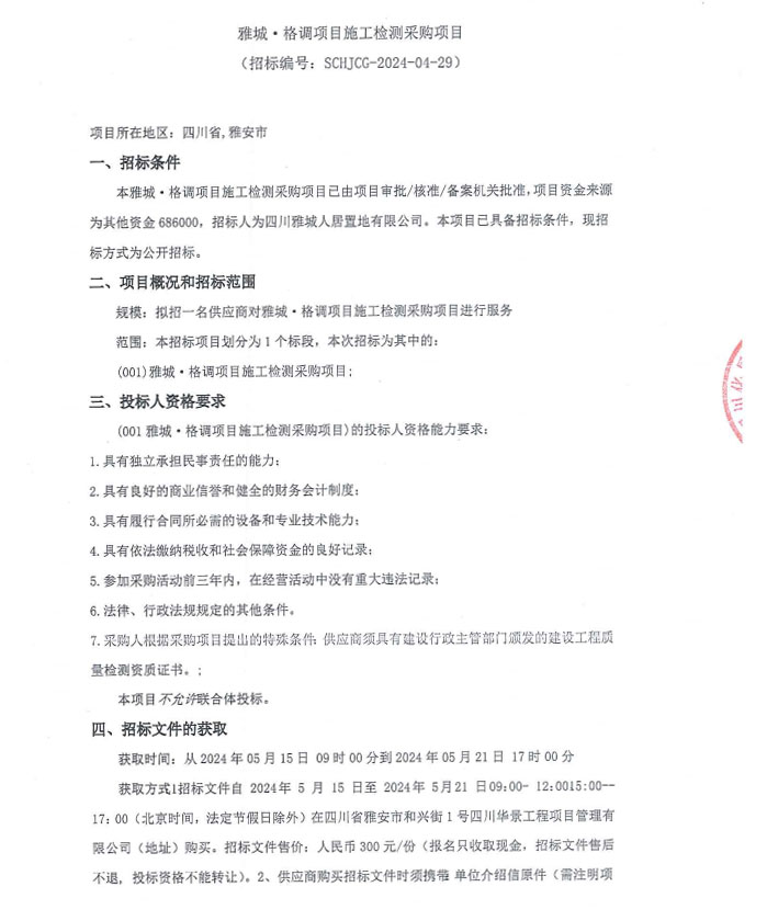 雅城·格調(diào)項(xiàng)目施工檢測采購項(xiàng)目公告