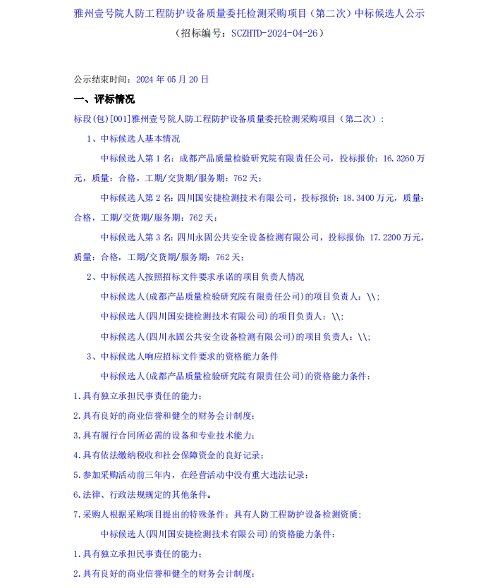 雅州壹號(hào)院人防工程防護(hù)設(shè)備質(zhì)量委托檢測(cè)采購(gòu)項(xiàng)目(第二次)中標(biāo)候選人公示