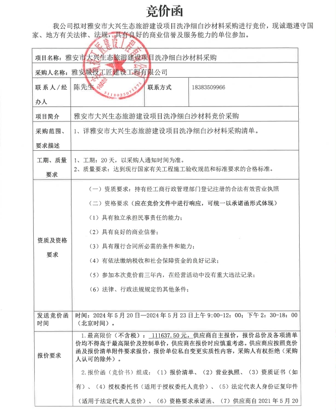 雅安市大興生態(tài)旅游建設(shè)項(xiàng)目洗凈細(xì)白沙材料采購競價(jià)公告