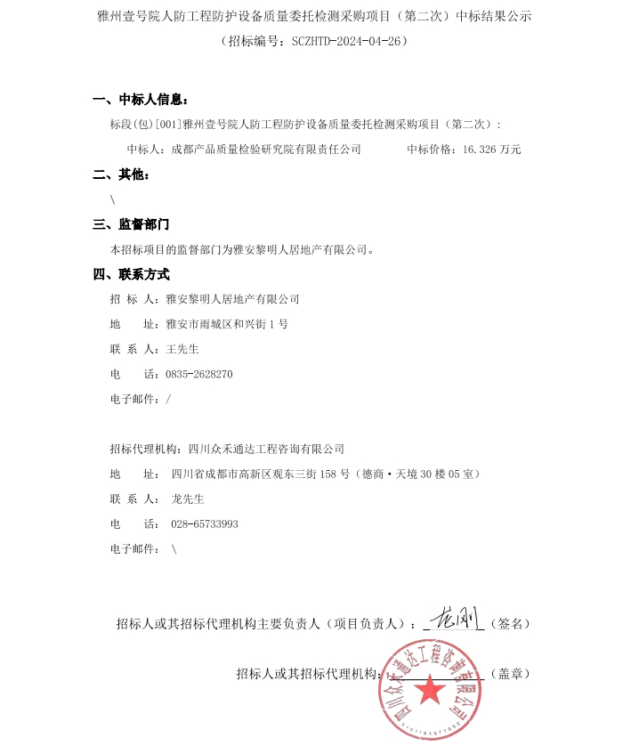雅州壹號院人防工程防護設(shè)備質(zhì)量委托檢測采購項目(第二次)中標(biāo)結(jié)果公示