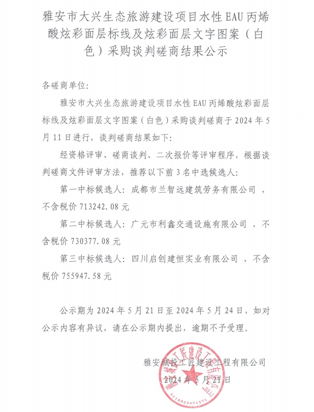 雅安市大興生態(tài)旅游建設(shè)項目水性EAU丙烯酸炫彩面層標線及炫彩面層文字圖案(白色)采購談判磋商結(jié)果公示
