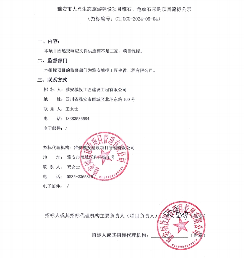 雅安市大興生態(tài)旅游建設(shè)項(xiàng)目雅石、龜紋石采購項(xiàng)目流標(biāo)公示